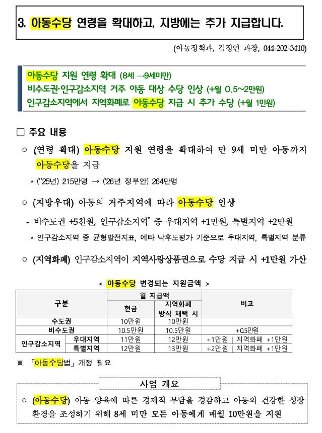 이처럼 아동수당 이외에도 지역기반 인구감소 대응, 지방 일자리 확대, 지역 소비 활성화 전략이 병행되고 있습니다.
