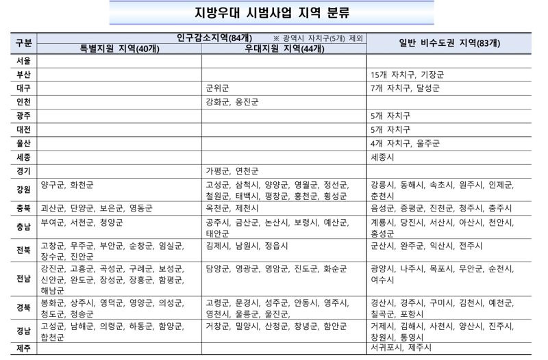지원 구분은 ‘특별지원지역’, ‘우대지원지역’, ‘일반지역’ 3단계이며, 농어촌·인구감소·낙후지역이 중심입니다.